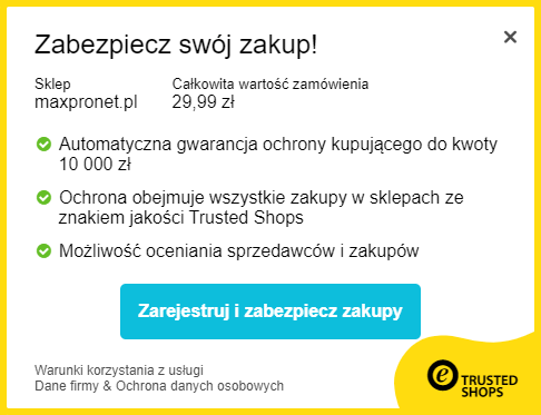 W każdym sklepie ze znakiem jakości Trusted Shops możesz bezpiecznie robić zakupy - zwłaszcza dzięki naszej gwarancji zwrotu pieniędzy. Wystarczy jedno kliknięcie, aby bezpośrednio po dokonaniu zamówienia bezpłatnie zabezpieczyć dokonane zakupy w sklepie posiadającym znak jakości Trusted Shops. Zabezpieczenie zostanie automatycznie rozszerzone również na wszystkie przyszłe zakupy w sklepach do kwoty 10 000 zł. Okres obowiązywania zabezpieczenia na dane zakupy wynosi 30 dni.